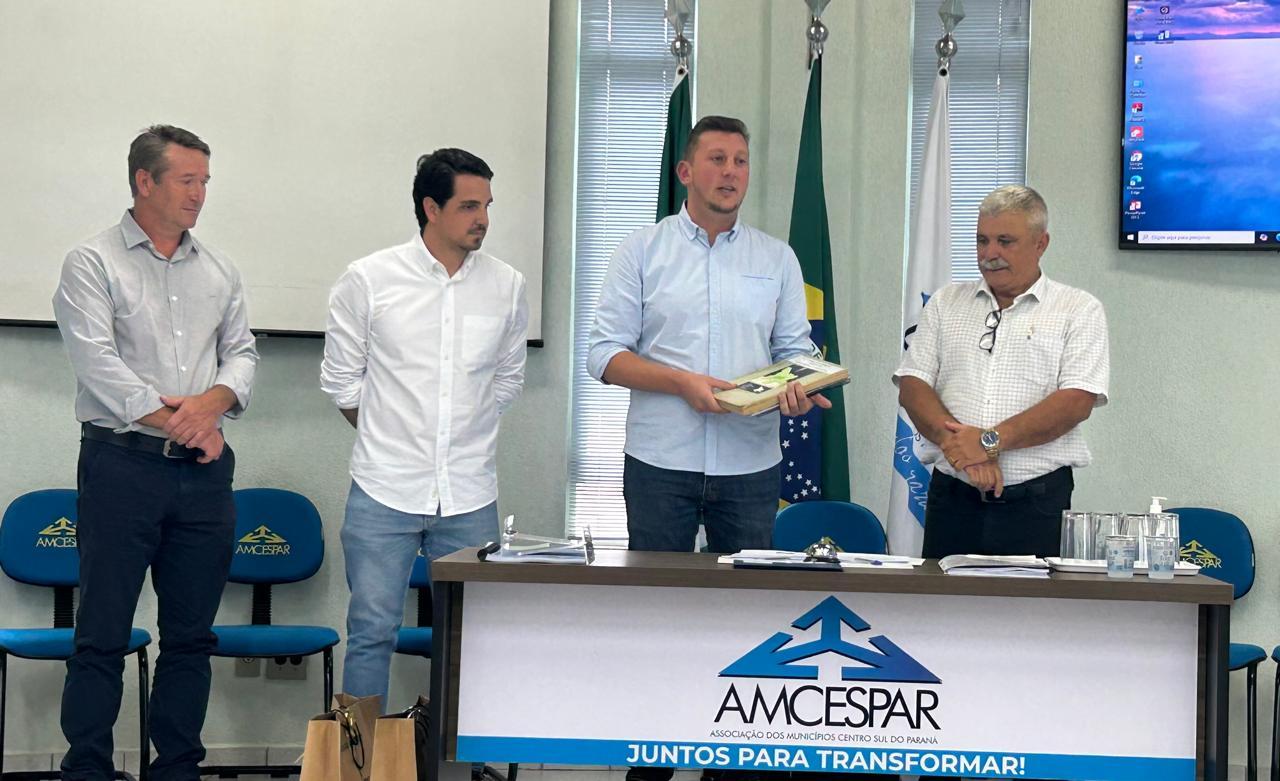 O prefeito de Rio Azul, Leandro Jasinski, assume a presidência da Associação dos Municípios do Centro-Sul do Paraná (AMCESPAR). Ele substitui o ex-prefeito de Irati, Jorge Derbli. A nova mesa diretora do biênio de 2025-2026 eleita por unanimidade conta, ainda, com o prefeito de Irati Emiliano Gomes como vice-presidente, e o prefeito de Inácio Martins, Dimas Vier, como tesoureiro.